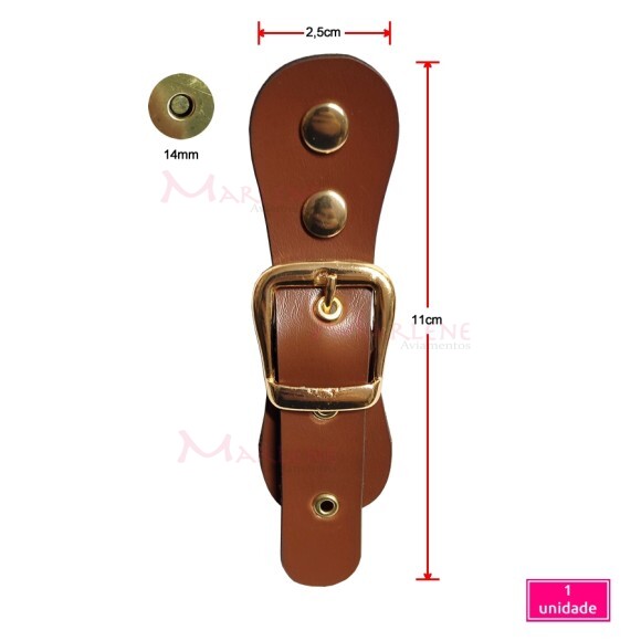 Uso: Usado para bolsas, carteiras, entre outros adereços com fecho. Feito em material sintético, botão ímã 14mm rebites nº3 e fivela metal, deixando o seu trabalho elegante.
