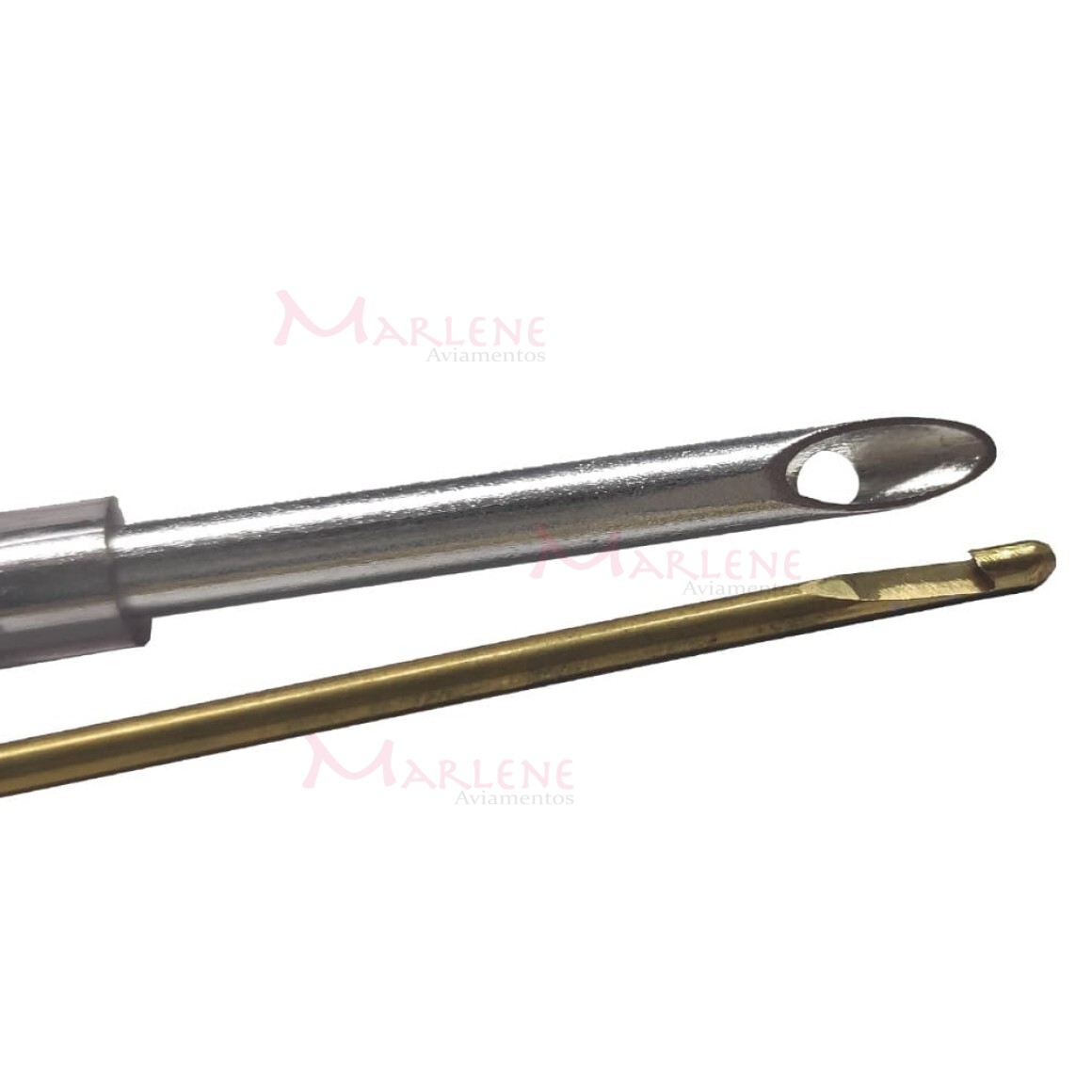 Uso: Usada para bordado com bastidor utilizando juta ou talagarça, na confecção de tapetes, almofadas, quadros e outros itens de decoração. Formada por três partes: A agulha propriamente dita, os anéis redutores, que permitem virar o cumprimento do ponto e o puxador que serve para passar o fio pela parte interna da agulha, deixando-o pronto para utilização.