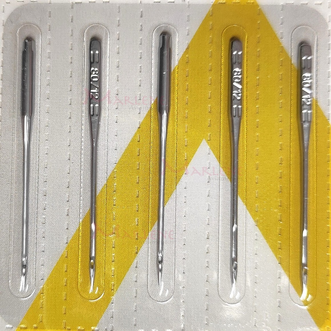 Uso: Agulha ponta seta ou universal, usada em máquinas domésticas para costura de tecidos mais leves, seja planos, naturais ou sintéticos, como: tule, chifon, organza, cetim, voal, entre outros.
