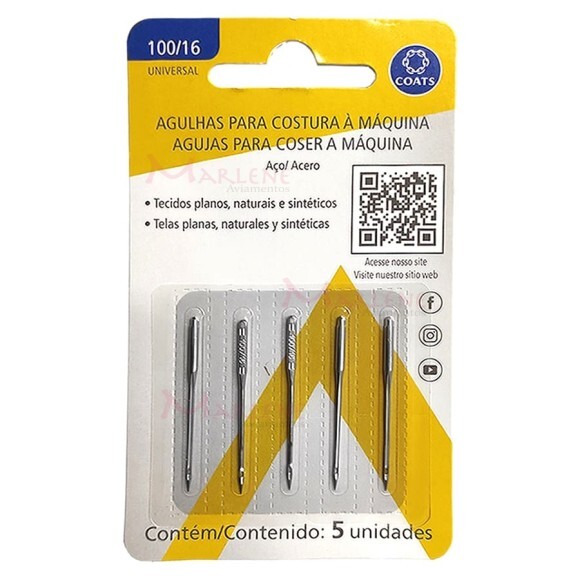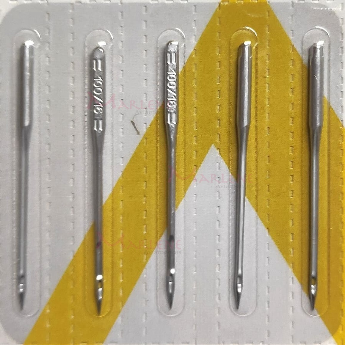 Uso: Agulha ponta seta ou universal, usada em máquinas domésticas para costura de tecidos médios-pesados, seja planos, naturais ou sintéticos, como: tecidos para casacos, gabardine. lona, tecidos reforçados, tecidos de tramas fechadas, entre outras.