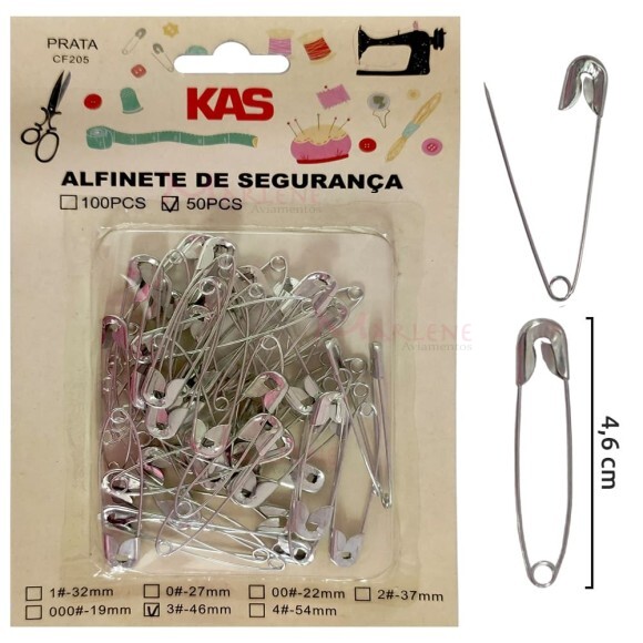 Detalhes: Alfinete de segurança nº3(46mm) níquel com 50 unidades KAS