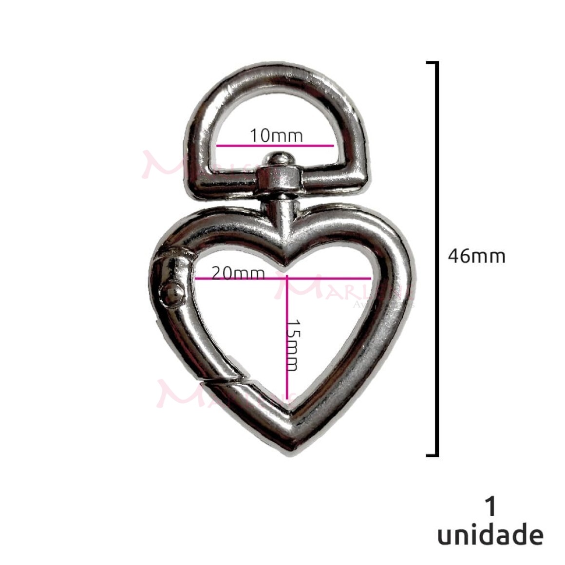 Uso: Utilizado como mosquetão articulado em forma de coração em bolsas, mochilas, acessórios decorativos ou chaveiros, pulseiras ou colares de correntes, entre outros itens.
