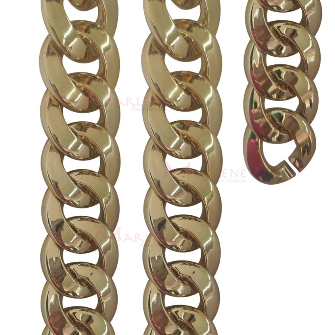 Detalhes: Corrente de resina elo 34X32mm dourada com aproximidamente 53 elos no metro