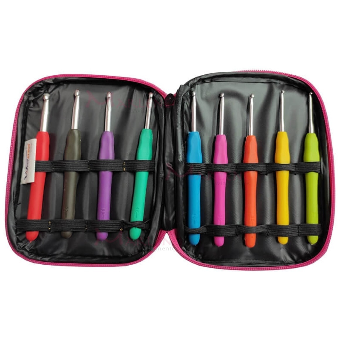 Uso: Usada para fazer crochê, com 9 tamanhos, ideal para diversos tipos de trabalhos. Com sua estrutura de alumínio e cabo soft emborrachado, são leves e práticas, tornam o manuseio bem confortável. Ainda conta com a facilidade de vir em um prático estojo para guardar e organizar suas agulhas.