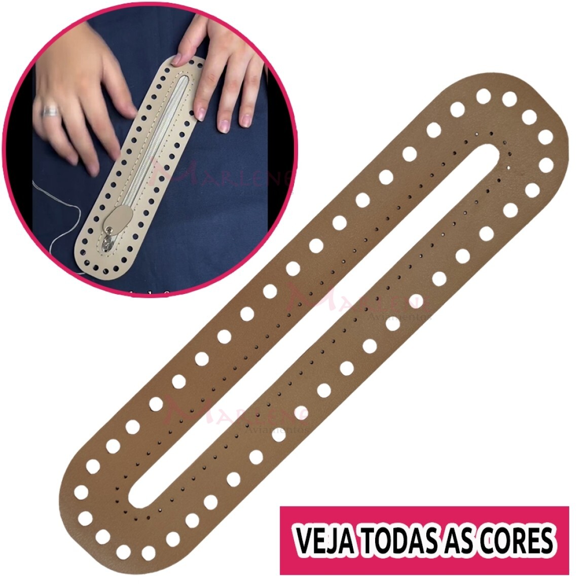 Uso: O acessório de couro sintético para zíper , te proporciona muito mais agilidade e beleza para finalizar o fechamento de suas bolsas, pois, já vem com os furos prontos para colocar o zíper e depois só costurar na sua bolsa de crochê, não necessitando perder tempo com furos manuais. Super combina com outros acessórios como fundo de bolsa, fechos de corino ou metal, além de portas alças.