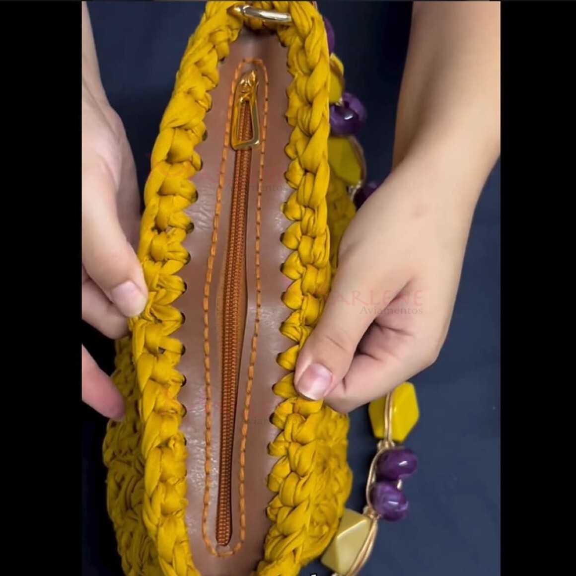 2. Acessório de corino para zíper em bolsa de crochê com 25x6cm