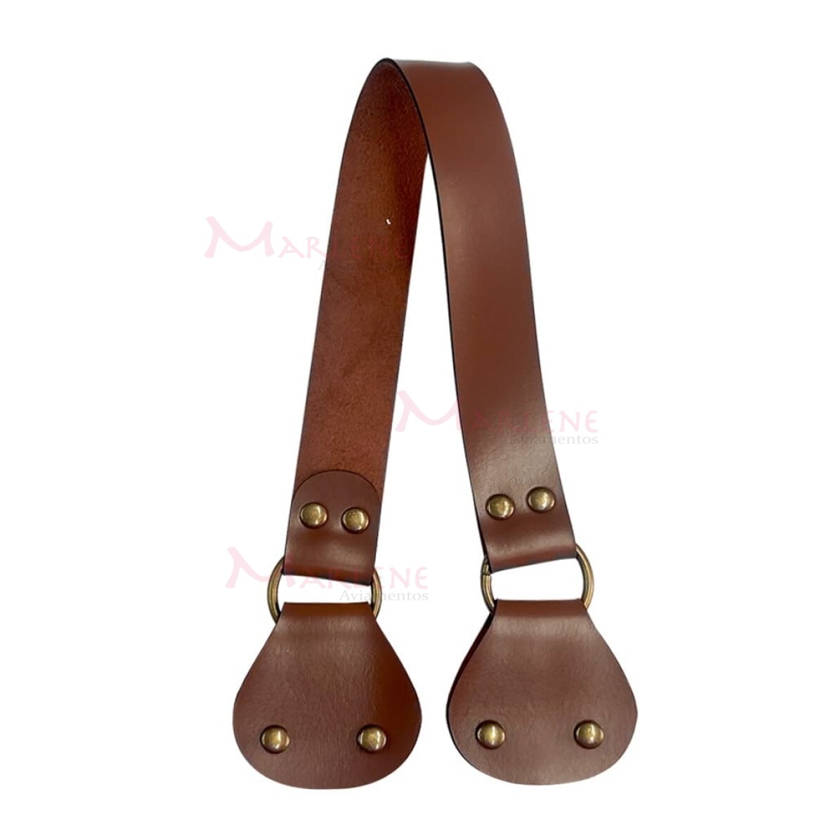 Uso: Alça de bolsa para ombro em couro sintético, fechamento com rebites duplos e argola de ferro. Utilizada para bolsa de crochê, tricô, entre outros. Deixa sua bolsa bonita e elegante.