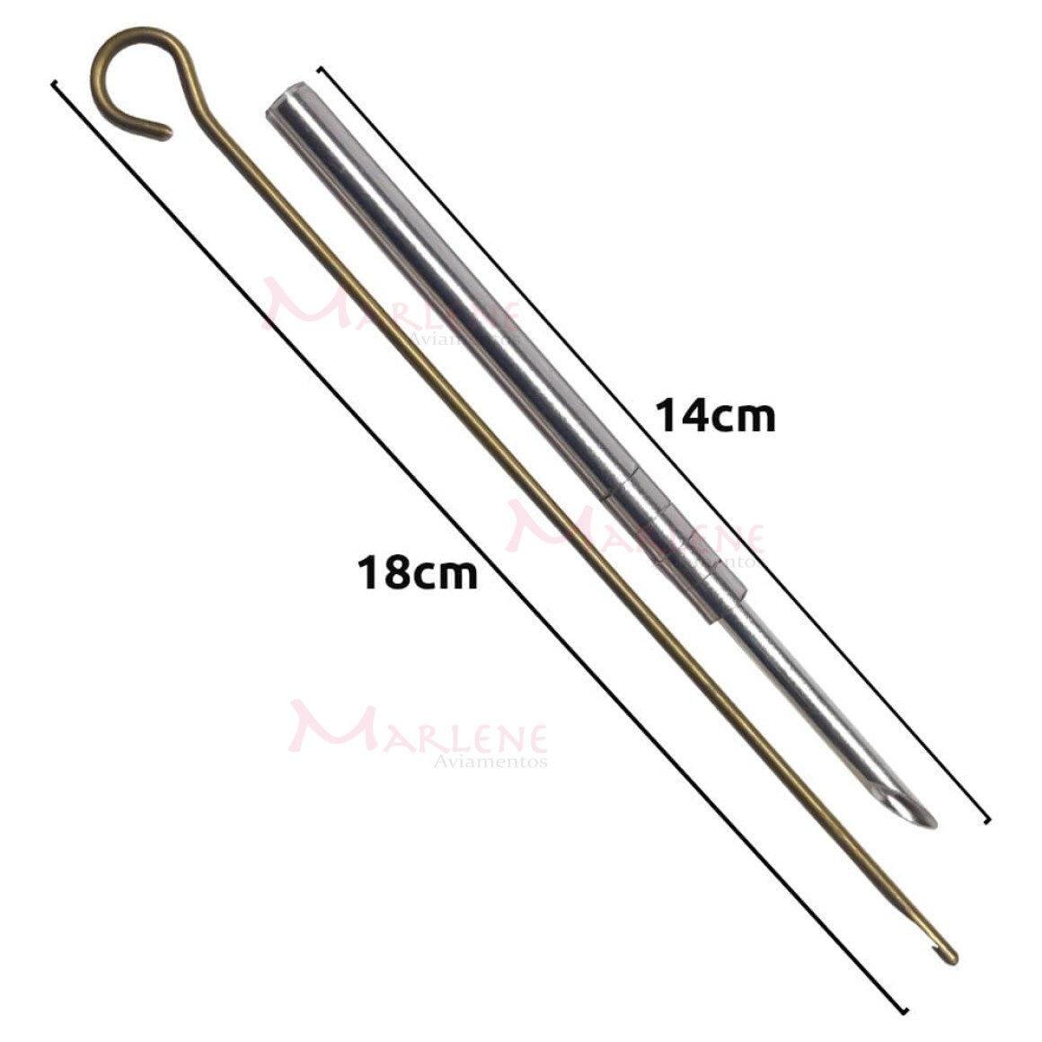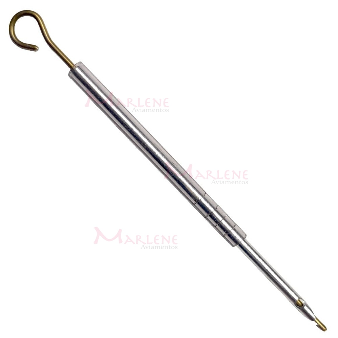 Uso: Usada para bordado com bastidor utilizando juta ou talagarça, na confecção de tapetes, almofadas, quadros e outros itens de decoração. Formada por três partes: A agulha propriamente dita, os anéis redutores, que permitem virar o cumprimento do ponto e o puxador que serve para passar o fio pela parte interna da agulha, deixando-o pronto para utilização.
