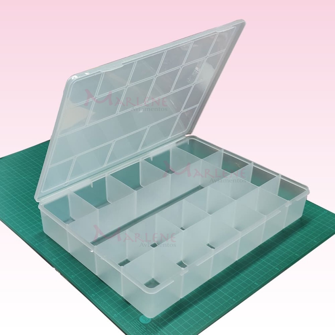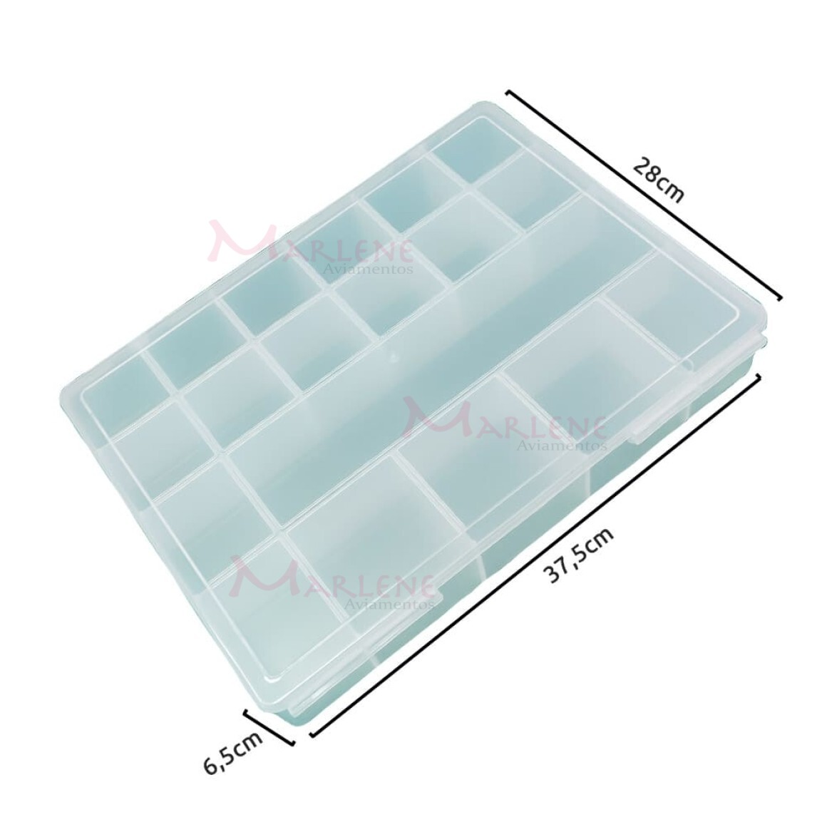 Uso: Caixa plástica grande usada para organizar objetos de costura como botões, bobinas e cursores. Serve também para parafusos, presilhas, bijouterias, remédios, itens escolar, material de pesca e ferramentas.