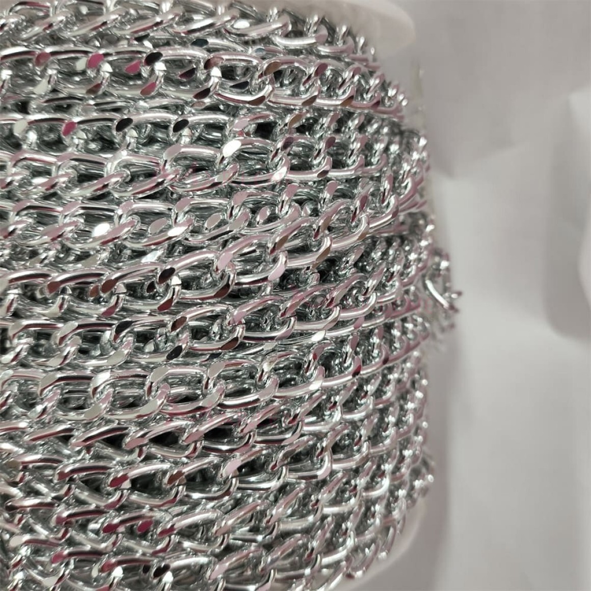 Uso: Corrente de alumínio utilizada principalmente para alça de bolsa ou para cintos, é super resistente e elegante. Além disso, por ser de alumínio, pode ser usada em vestuário sem medo de enferrujar. Corrente fina para média.