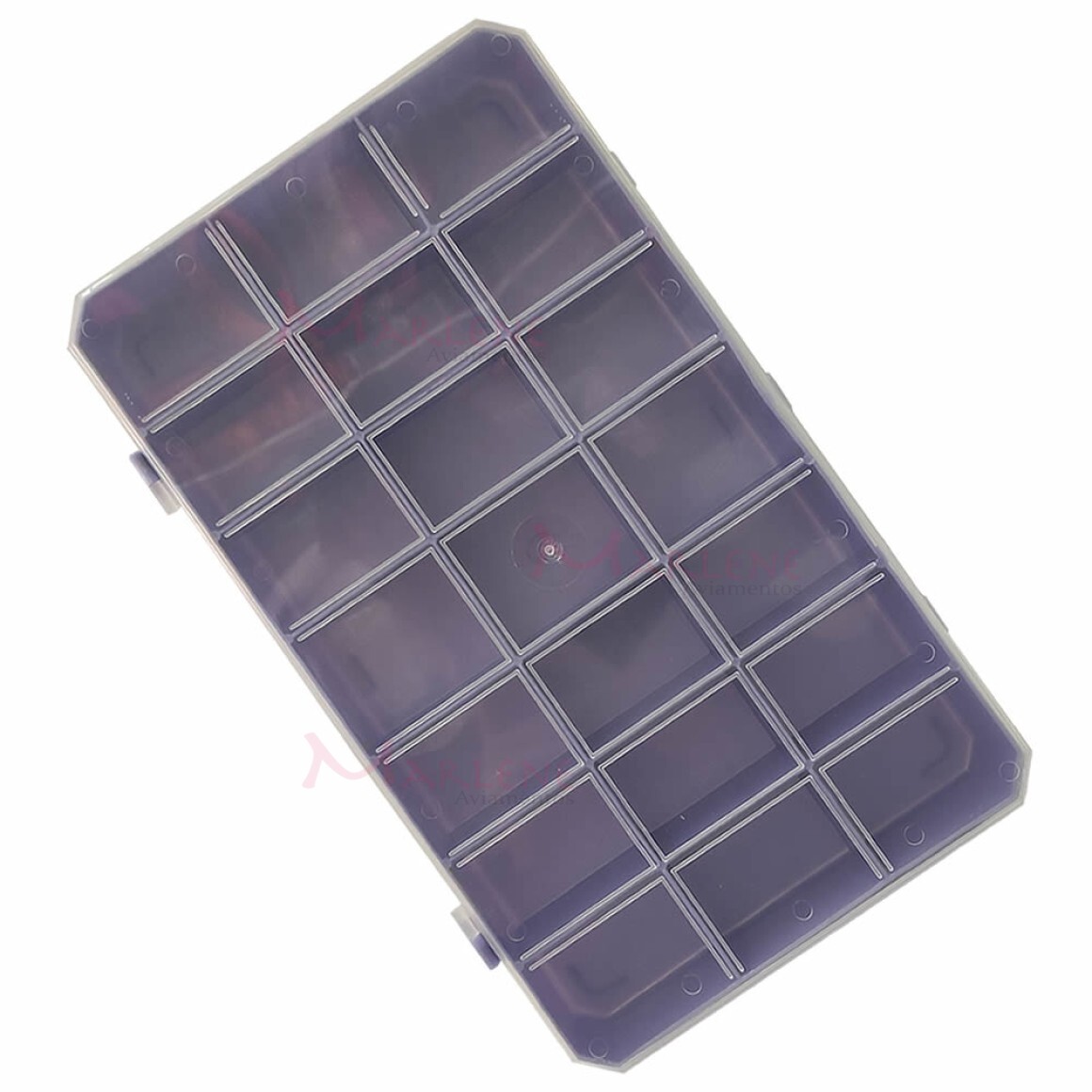 Detalhes: Estojo retangular lilás com 21 divisórias
