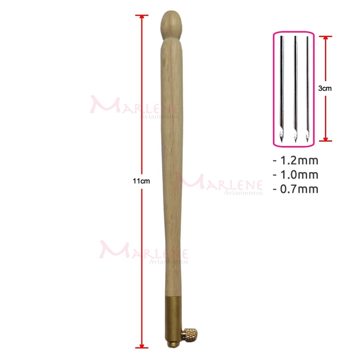 Uso: Usada para bordar pedrarias em diversos tipos de tecidos. Possui cabo de madeira com ponta de metal e regulagem para troca das agulhas. As agulhas são de 3 tamanhos: 0,7mm, 1,0mm e 1,2mm. Cabo com 11cm e agulhas com 3 cm de comprimento.