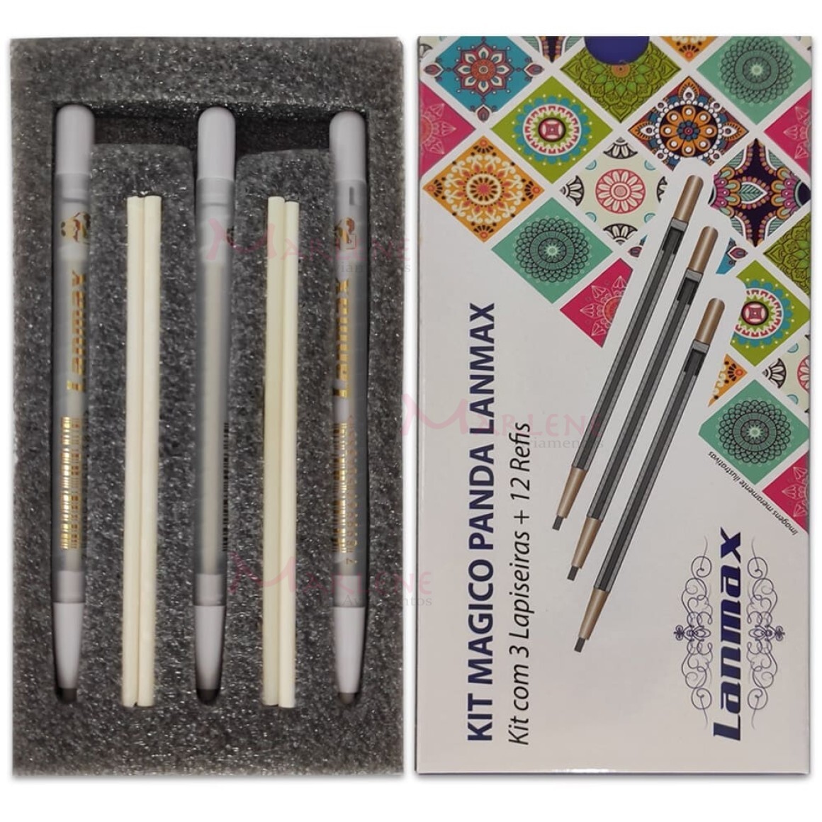Detalhes: Kit mágico com 3 lapiseiras e 12 refís Lanmax para tecido apaga com calor