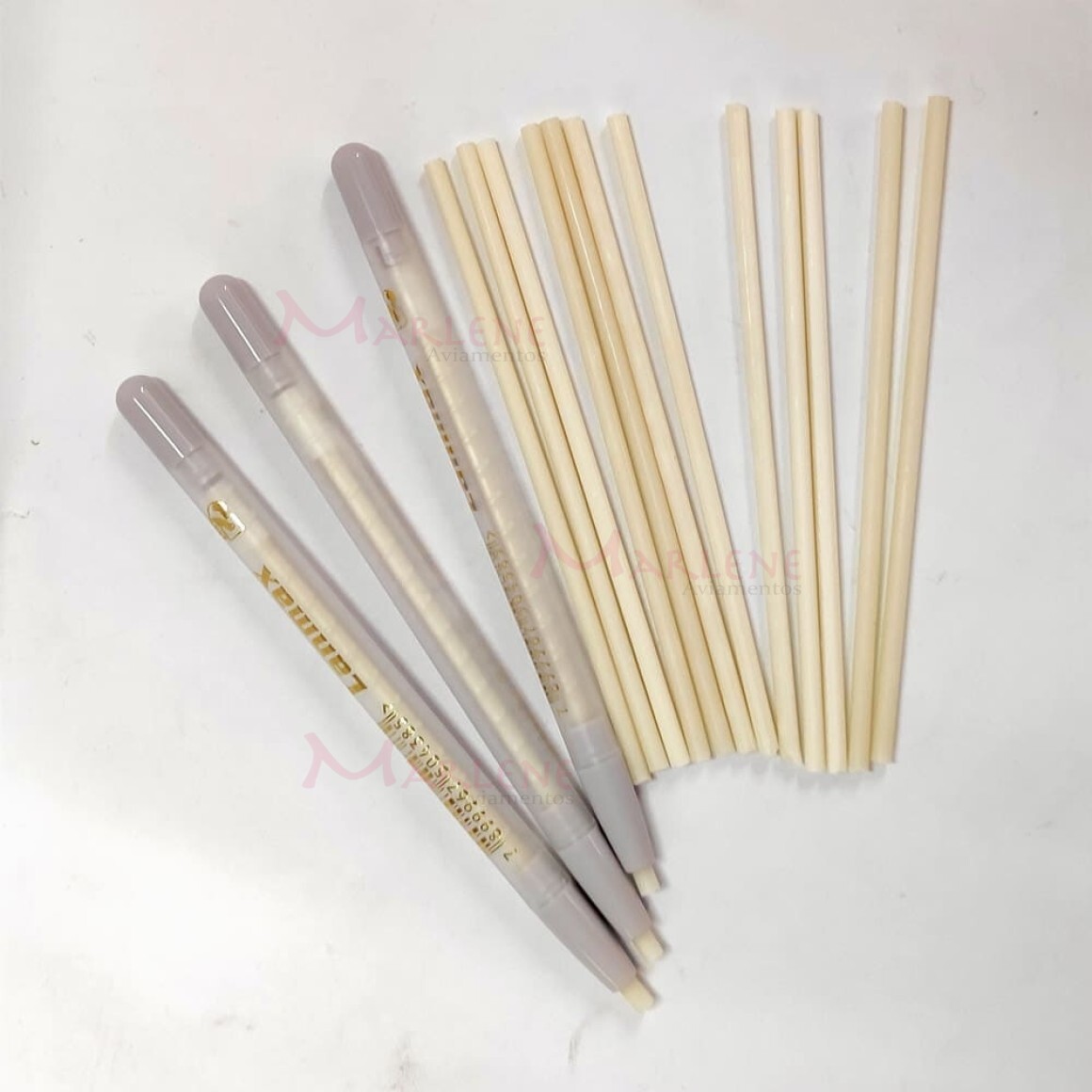 Uso: O kit lapiseira e refil mágico, é super prático, pois você pode utilizá-lo para riscar em trabalhos de alfaiataria, costura, confecções e depois do trabalho feito, é só passar o ferro, que o traço do mesmo desaparece com o calor. Possui a facilidade de poder remover o refil da lapiseira e ter várias cargas de reposição.