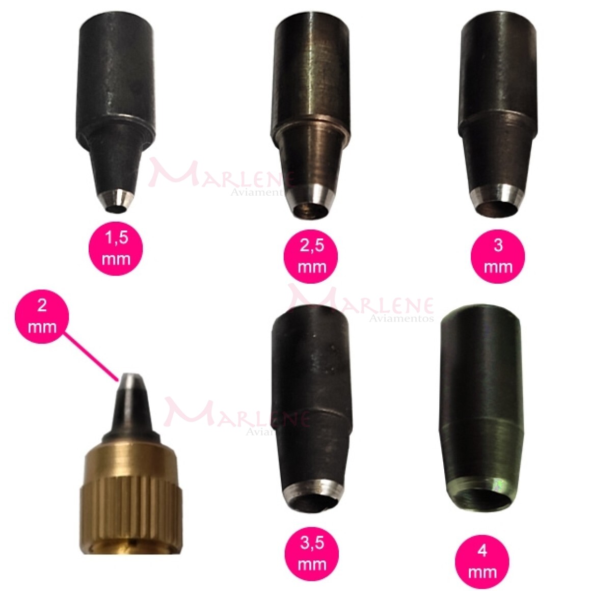 Quantidade: 1 Kit (1 furador, 1 ponta de 1,5mm, 1 ponta de 2mm, 1 ponta de 2,5mm, 1 ponta de 3mm, 1 ponta de 3,5m e 1 ponta de 4mm)