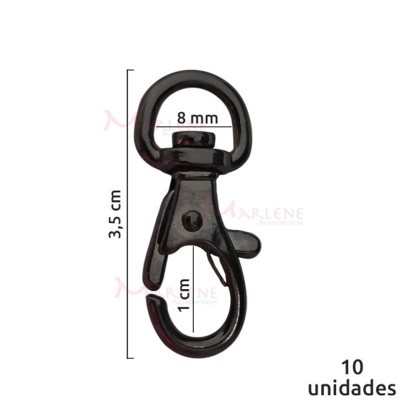 Uso: Mosquetão usado em bolsas, mochilas, acessórios decorativos, chaveiros, entre outros. Possui uma alavanca para auxiliar na abertura.