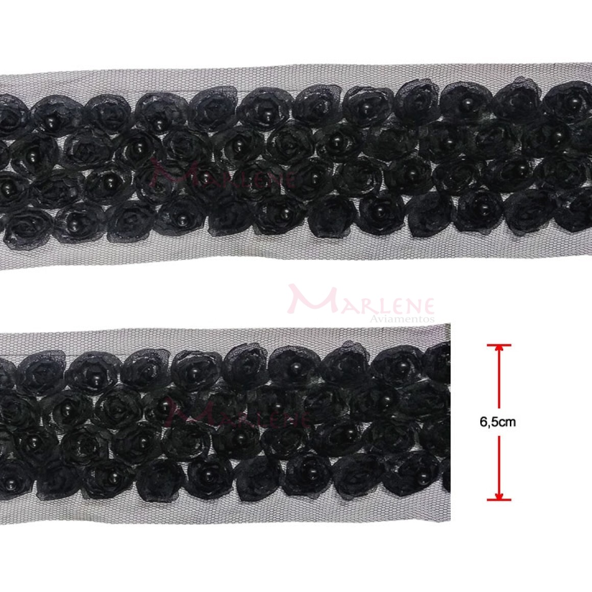 Detalhes: Passamanaria flor 4 fileiras com pérolas preta por metro