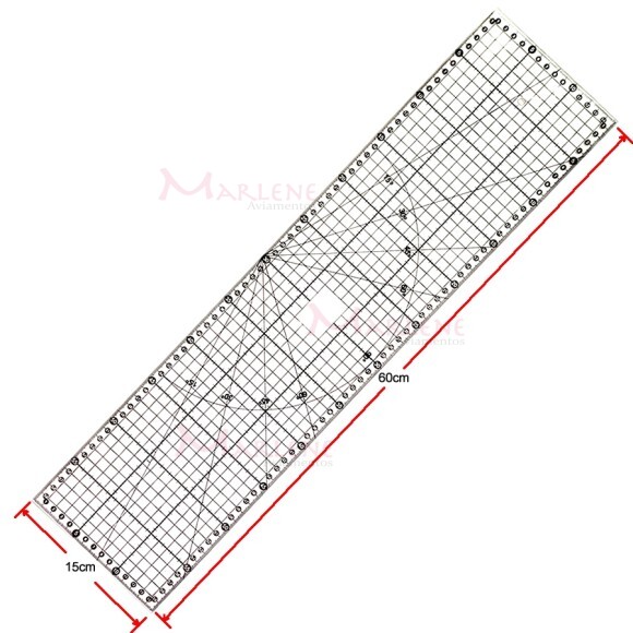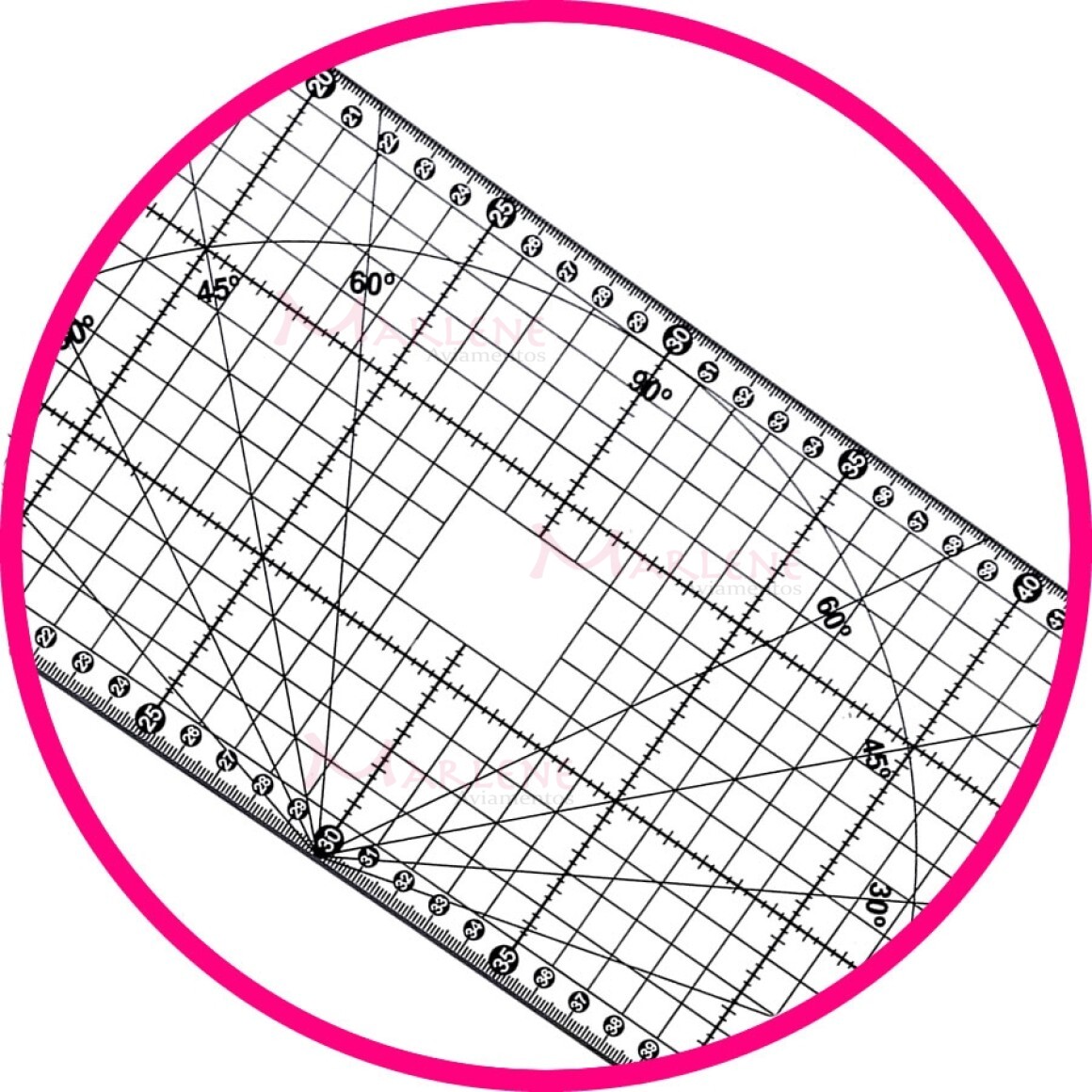 Uso: Usado para trabalhos em patchwork, por exemplo, tecidos, moldes, retalhos quadrículados, entre outros. Sua transparência facilita na hora de trabalhar com tecidos coloridos. Possui marcaçao em cm e internamente quadriculados de 1cm², além de ângulos de 15º,30º, 45º, 60º e 90º.